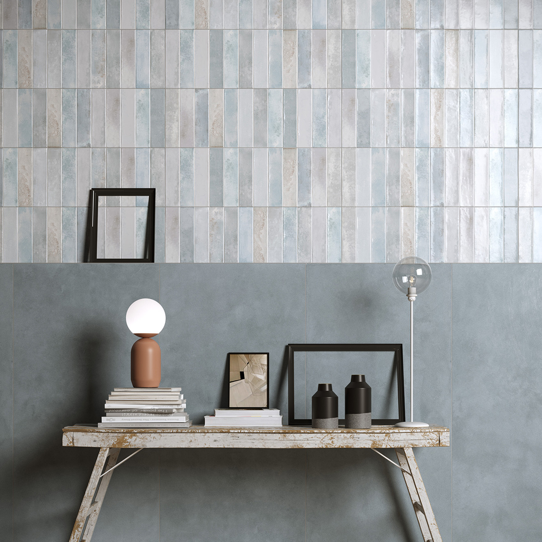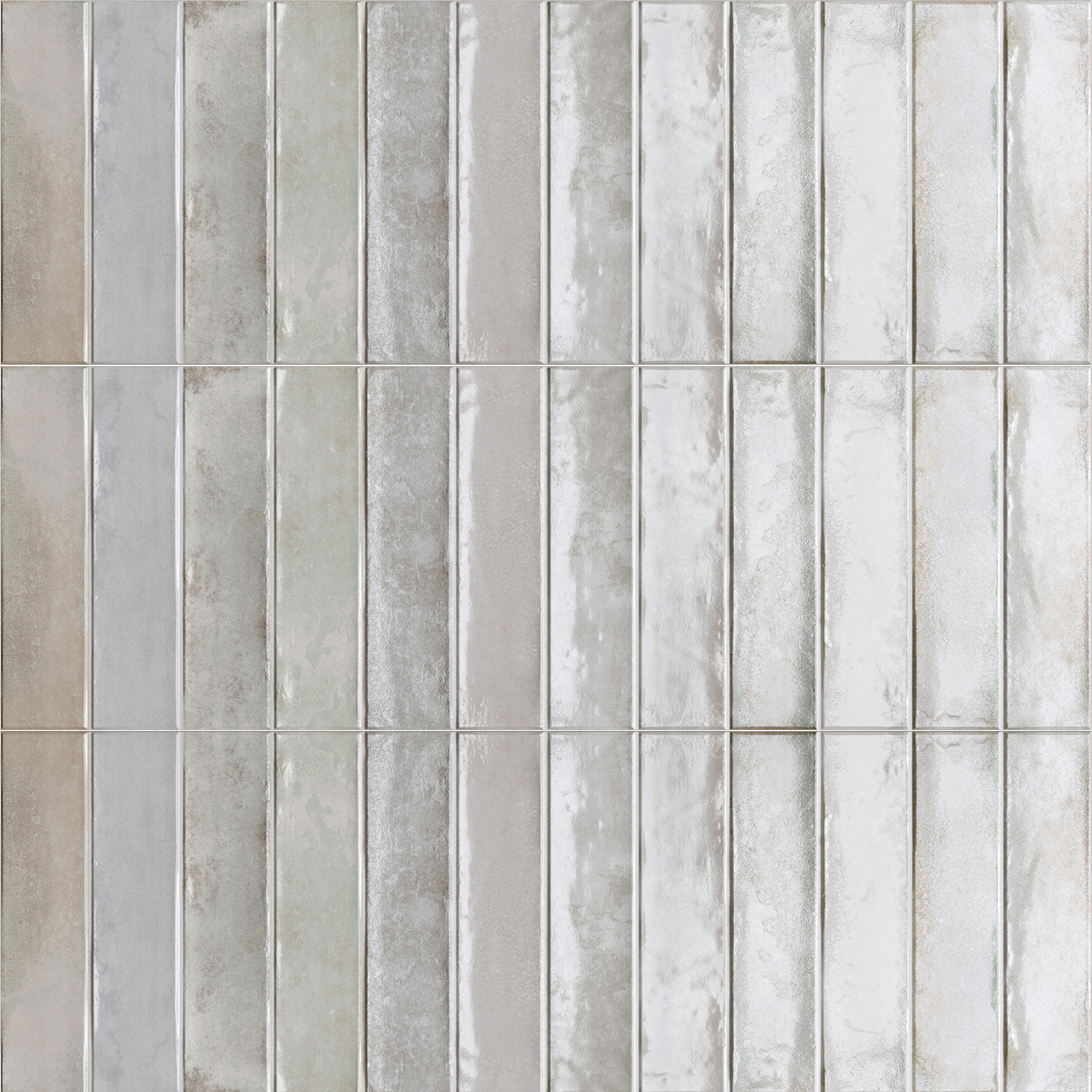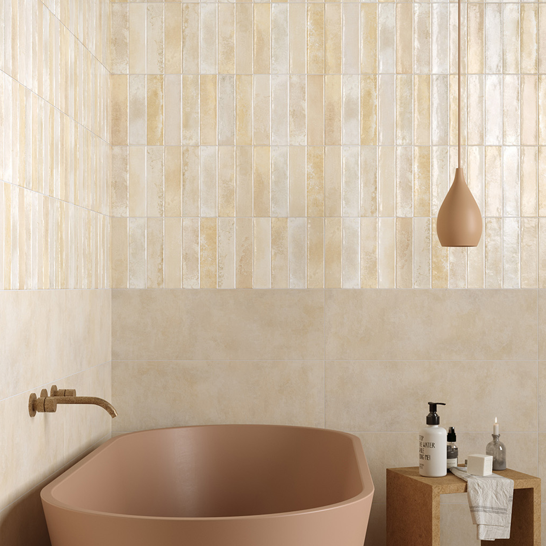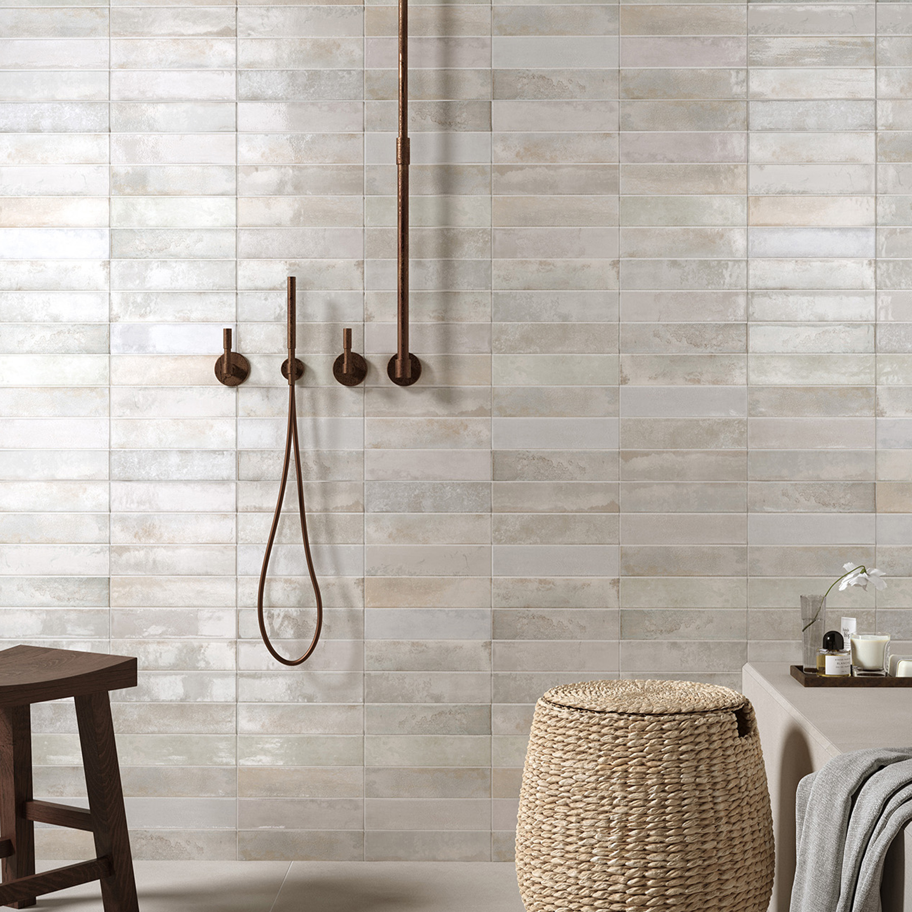 - Quattro varianti “muretto preinciso” 25×75: Pearl, Sage, Sand e Sky, caratterizzate da una texture tridimensionale che aggiunge profondità e dinamismo alle superfici.