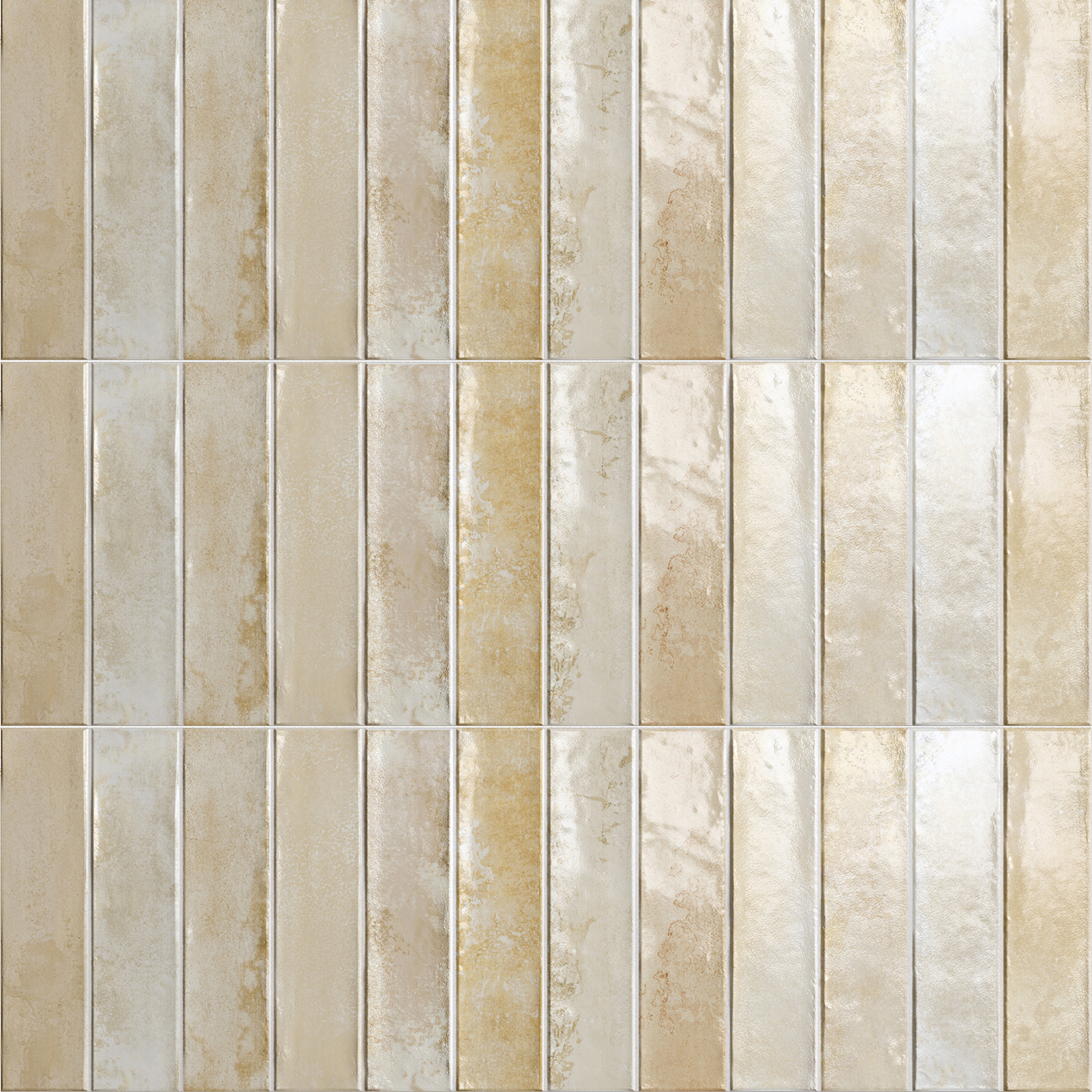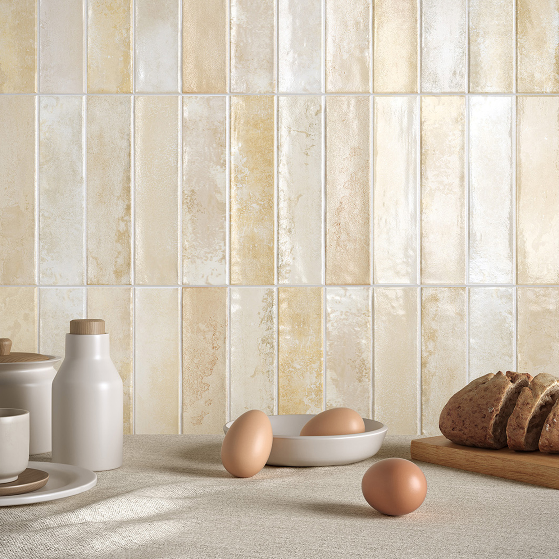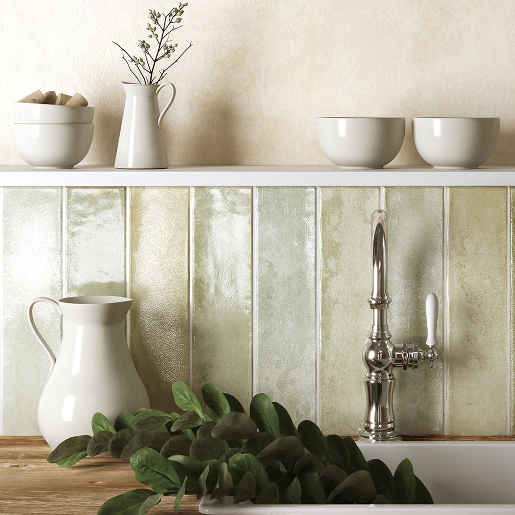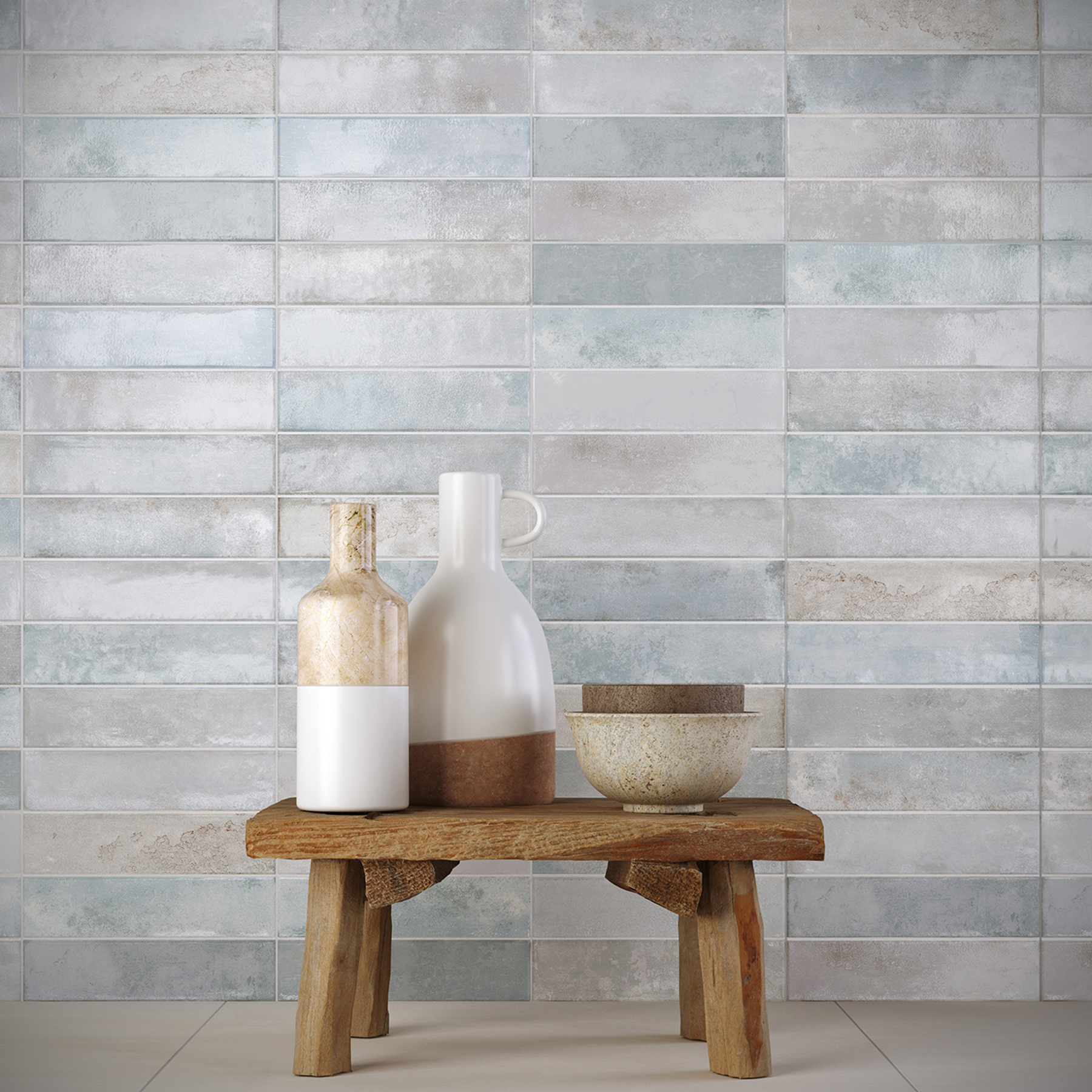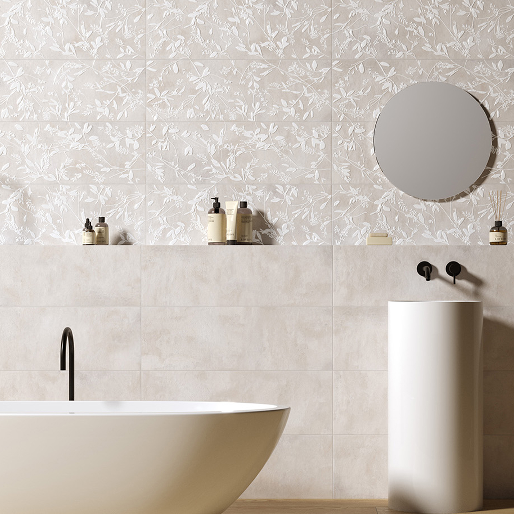 - Quattro varianti “muretto preinciso” 25×75: Pearl, Sage, Sand e Sky, caratterizzate da una texture tridimensionale che aggiunge profondità e dinamismo alle superfici.